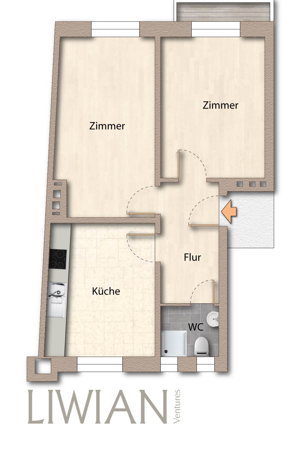 Die zauberhafte 2-Zimmer-Wohnung befindet sich im 2. Obergeschoss des Ensembles.